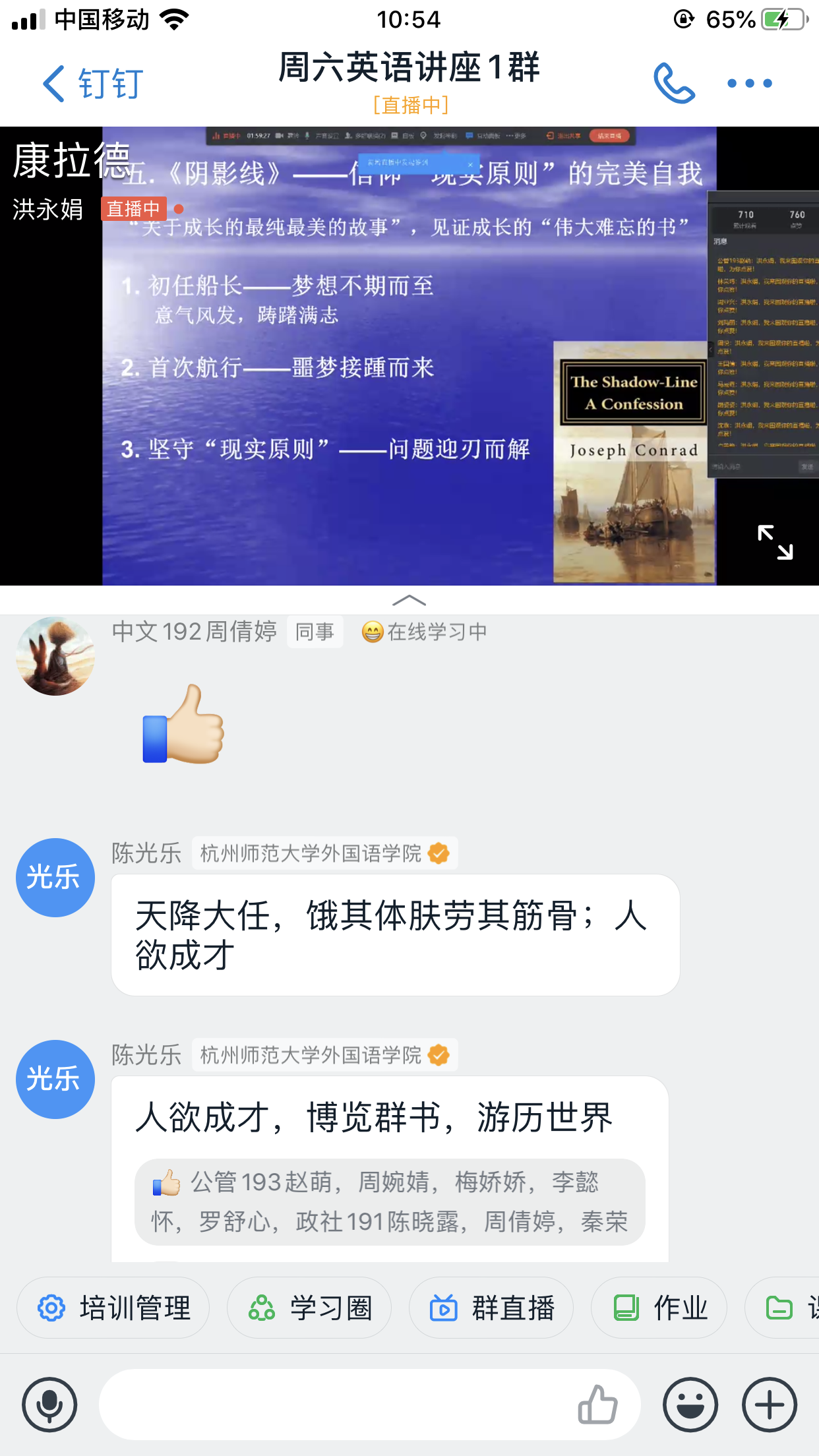 随着周六讲座在学生中的口碑效应,讲座群数目前已增加到3个,加入讲座群的学生总人数已达到1935人,由于部分学生时间冲突,截止到5月23日晚12点,本次讲座实际参与学生数为1253人,已连续六周突破1000人次,同时,依然源源不断有学生选择直播回放,继续在“周六英语学习社区”里努力学习。学生来源主要为2019级非英语专业的学生,同时,也吸引了部分英语专业及浙江外国语学院的学生来参加学习,观看直播的总人次达到1701次。