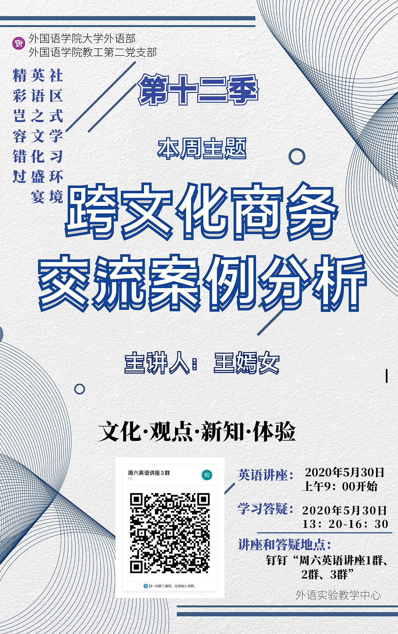 2020年5月30日周六上午,为了提升同学们的跨文化能力,大学外语部的王嫣女老师特意为同学们带来了一场以“跨文化商务交流案例分析”为主题的讲座。