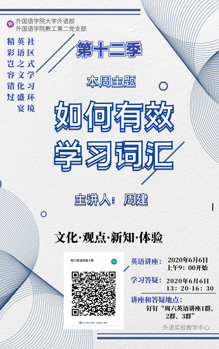 2020年6月6日周六上午9点,针对同学们记单词的“老大难”问题,大学外语部的周建老师特意带来了一场以“如何有效学习词汇”为主题的讲座。本次讲座主要探讨有效学习词汇的策略,分理论与实践两个部分。理论部分方面,周老师首先从语言学角度帮助学生了解英语词汇学习的几个视角,即形式视角,包括拼写,形态和语音;语义视角,包括指示,内涵和文化;以及语境视角,包括句法,搭配,语域,措辞等,从而厘清了困惑同学们已久关于词汇学习的一个基本问题,即:怎样才算学会一个单词?接着,周老师向同学们介绍了语料库语言学在词汇学习中的应用,通过导出三个重要的词汇列表,即一般用途词汇表,学术词汇表和专业词汇表,从而回答了词汇学习过程中的一个迫切问题,即:不同阶段,不同目标,什么样的词汇应该优先学习?实践部分方面,周老师则给同学们推荐了各种词汇学习资源,并一一演示了操作方法,比如词典软件、浏览器插件、各类在线资源等如何操作和使用。最后,周老师还带领同学们探讨了他们现有词汇学习策略的优劣,并给出了相应的建议。