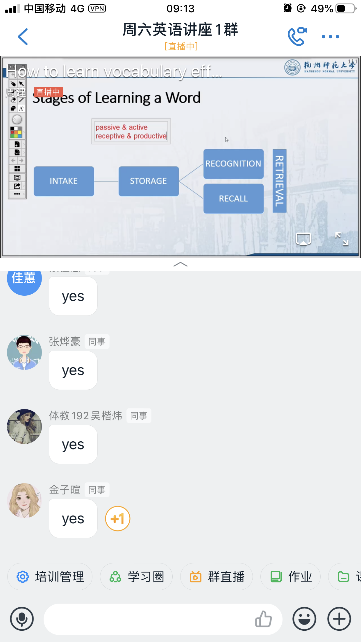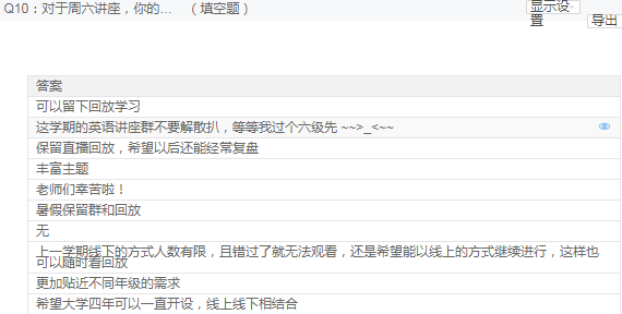 随着周六讲座在学生中的口碑效应,讲座群数目前已增加到3个,加入讲座群的学生总人数已达到1977人,由于部分学生时间冲突,截止到6月7日晚12点,本次讲座实际参与学生数为1246人,已连续八周突破1000人次,同时,依然源源不断有学生选择直播回放,继续在“周六英语学习社区”里努力学习。学生来源主要为2019级非英语专业的学生,同时,也吸引了部分英语专业及浙江外国语学院的学生来参加学习,观看直播的总人次达到1758次。