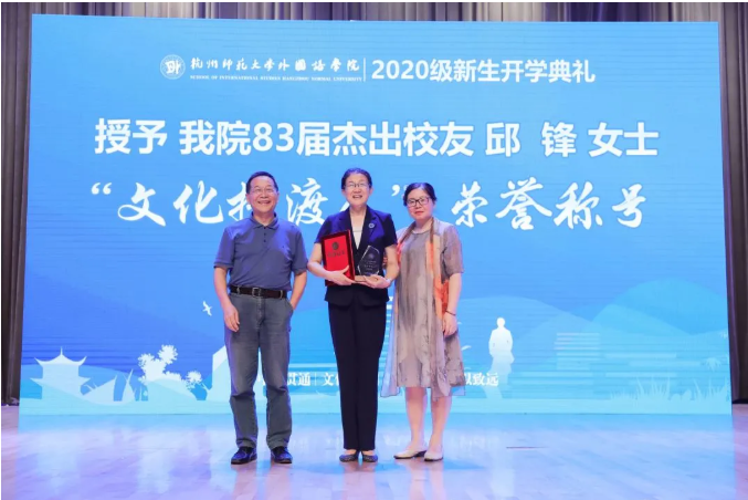 2020年9月16日晚,外国语学院在恕园7号楼小剧场隆重举行2020级新生开学典礼并为1983届英语专业杰出校友、全国优秀教师、正教授级高级教师邱锋女士颁发了“文化摆渡人”奖。