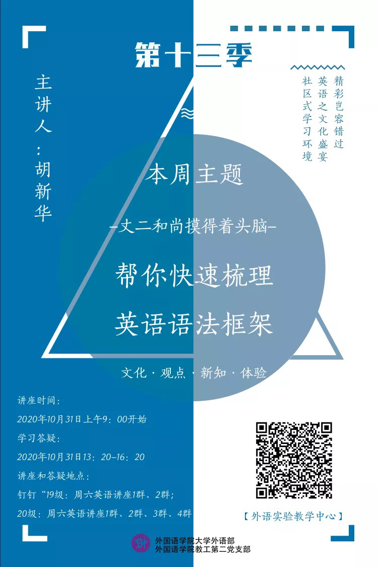 2020年10月31日周六上午9点,大学外语部的胡新华老师为同学们带来了主题为“丈二和尚摸得着头脑—帮你快速梳理英语语法框架”的讲座。此次讲座旨在为了让英语较为薄弱的同学对于英语基本句型和结构有个系统的认识,克服对于英语长句的恐惧;也让其他同学对于英语语法基本框架有个全面的认识和梳理,在阅读中更有效地划分句子结构,提高阅读质量。胡老师主要分析了英语的五种基本句型及主语、谓语、宾语、定语、状语、补语补足语的形式,并通过详实生动的例子对长难句的划分方法加以说明。整个讲座胡老师讲解非常详细具体,受到同学们的一致好评。