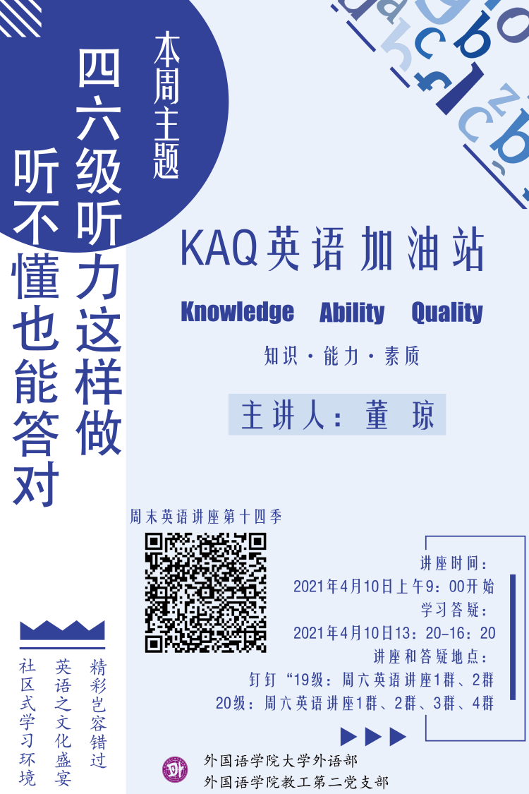 为了帮助同学们更好地备考大学四六级考试,2021年4月10日周六上午9点,大学外语部的董琼老师给同学们带来了以“四六级听力这样做,听不懂也能答对”为主题的讲座。四六级考试中的听力部分对很多同学来说是难点,普遍存在:听不懂,来不及读题目,跟不上节奏等问题。董琼老师的讲座《四六级听力这样做,听不懂也能答对》,从听前的心理建设入手,针对学生听力考试中的困难进行技巧点拨,提出“提前读题来预测、跟上节奏别掉队、边听边答做标记、听完再来猜一猜”这样四个步骤,并结合教师实例演示和学生实战操作,快速有效帮助提升答题正确率。