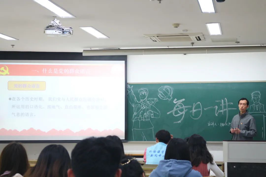 为庆祝中国共产党成立100周年,扎实推进学生党史学习教育,引导学生做好以“学党史、强信念、跟党走”为主题的课前“每日一讲”活动,2021年4月21日下午,日本色情片 在仓前校区恕园11-305开展专题辅导课,由全国党建工作样板支部、外国语学院教工第一党支部书记杨大然教授主讲,翻译181班全体学生参加。
