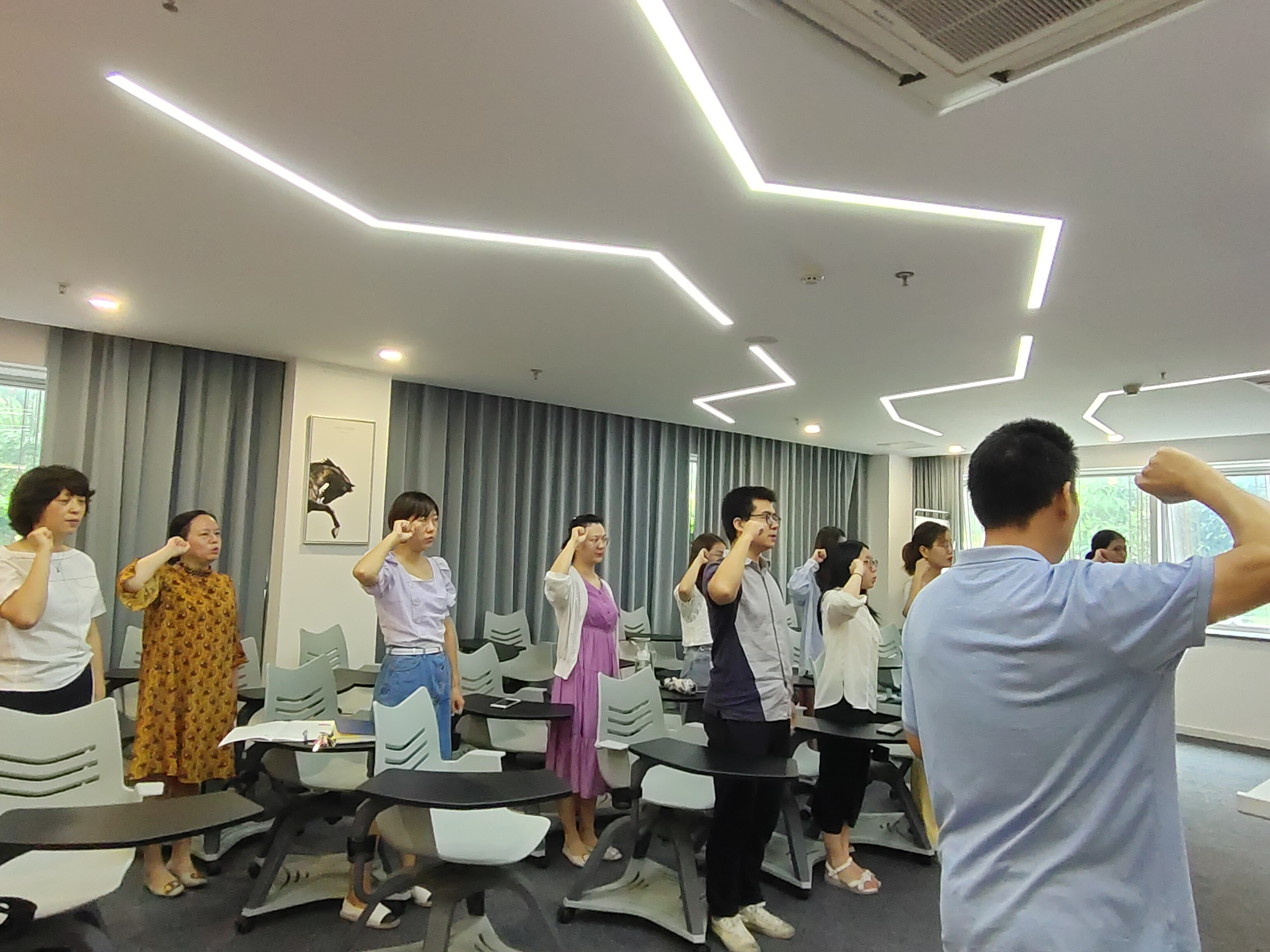 活动分为四个板块。第一阶段,大家观看了建党影片,在影片中回顾中国共产党的成立。党成立之际必然值得纪念,除此之外,入党誓词也是每一位党员需要铭记在心的,在第二阶段,外国语学院教工第三党支部书记陈宇锋老师带领大家重温入党誓词。第三阶段是重头戏,陈宇锋老师为大家讲解如何在虚拟世界里学习、感悟党史。老师的精彩讲解,让VR技术在大家心目中逐渐清晰起来,“纸上谈兵终觉浅,绝知此事要躬行”,大家在陈老师的带领下进入第四个阶段—“VR+党史学习”的时间体验。老师认真负责地确保每位同学都体验到VR技术,同学们也非常仔细地聆听老师的指导,慢慢沉浸在VR世界。