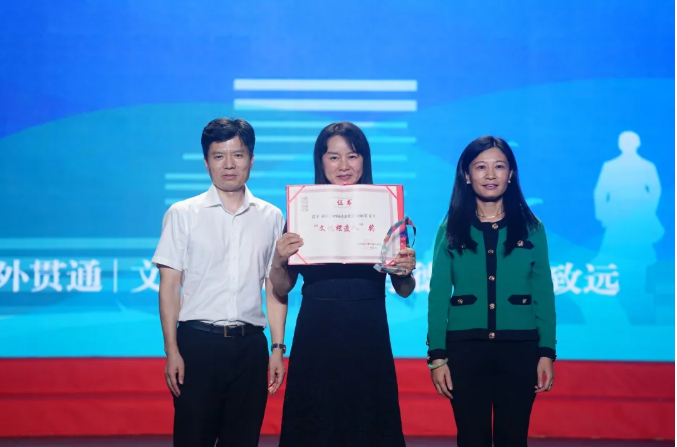 随后,院长周敏与院党委书记潘春雷为顾帼英校友颁发“文化摆渡人奖”奖杯与证书,以表彰和肯定其在中外文化交流传播中的杰出成就。