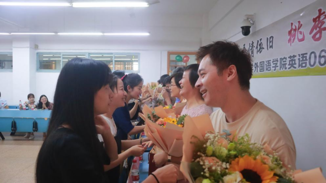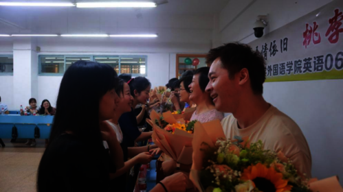 蔡云飞希望校友们多多支持和关心学校校友工作,并且欢迎大家回校进修充电、广泛开展各类合作。潘春雷则介绍了近十年来学校、学院的事业发展成果,并指出外国语学院是校友们永远的家,欢迎校友们经常回家看看。老师们也送上寄语,祝愿校友学有所成、前程似锦。校友们纷纷发言,深情地回首青葱年华,追忆校园往事,老师们当年的谆谆教导和同学间的深厚友谊,表达了对母校的思念及感谢,抒发了毕业十年的感慨之情。随后校友们向老师献上献花、卡片及十周年蛋糕。