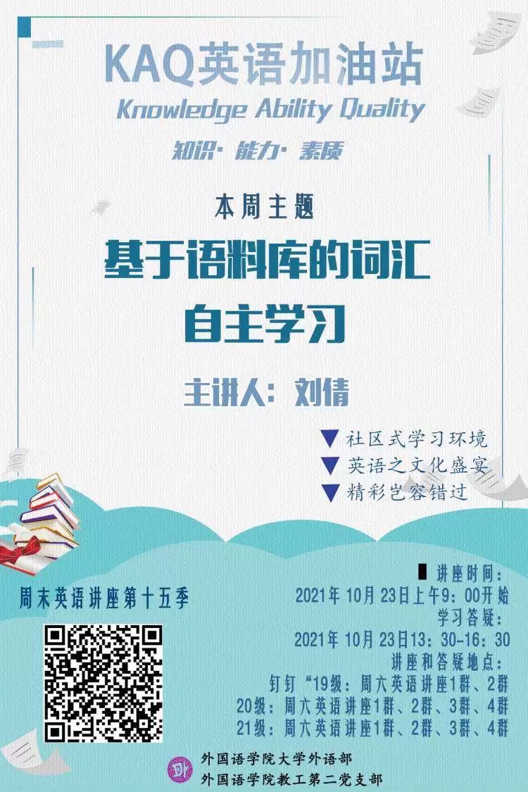 为更好地服务广大学生、满足其对英语学习的多样化和个性化需求,结合大学英语教学改革的实际,为在校学生营造良好的社区式英语学习氛围,从而提升学生的英语综合能力,大学外语部和教工第二党支部为全校学生开设的周末英语专题讲座活动目前已经进入了第十五季第二期。