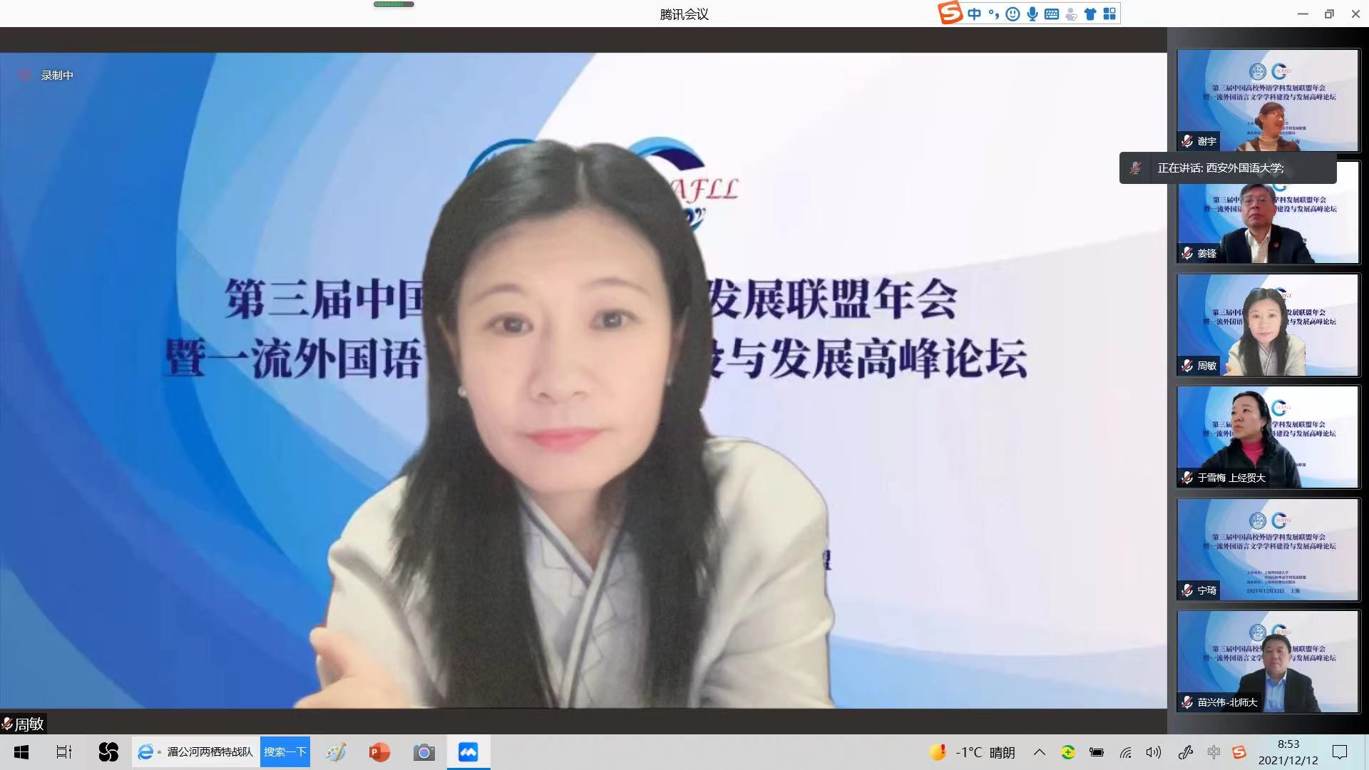 2021年12月11—12日,第三届中国高校外语学科发展联盟年会暨一流外国语言文学学科建设与发展高峰论坛在上海外国语大学举办。大会共设12场主旨发言,上海外国语大学党委书记姜锋、校长李岩松、北京外国语大学杨丹校长、广东外语外贸大学天佑启校长、西安外国语大学王启龙校长、对外经济贸易大学夏文斌校长、大连外国语大学刘宏校长、天津外国语大学陈法春校长、北京 日本色情片 宁琦院长等在大会做主旨报告。16所高校的外国语学院院长主持了8个分论坛的讨论,近百所知名院校的200余名外语学科专家相聚云端,共论学科发展。近万人在B站观看了论坛直播。 日本色情片 院长周敏教授应邀参会并代表教材组在闭幕会上做总结报告。