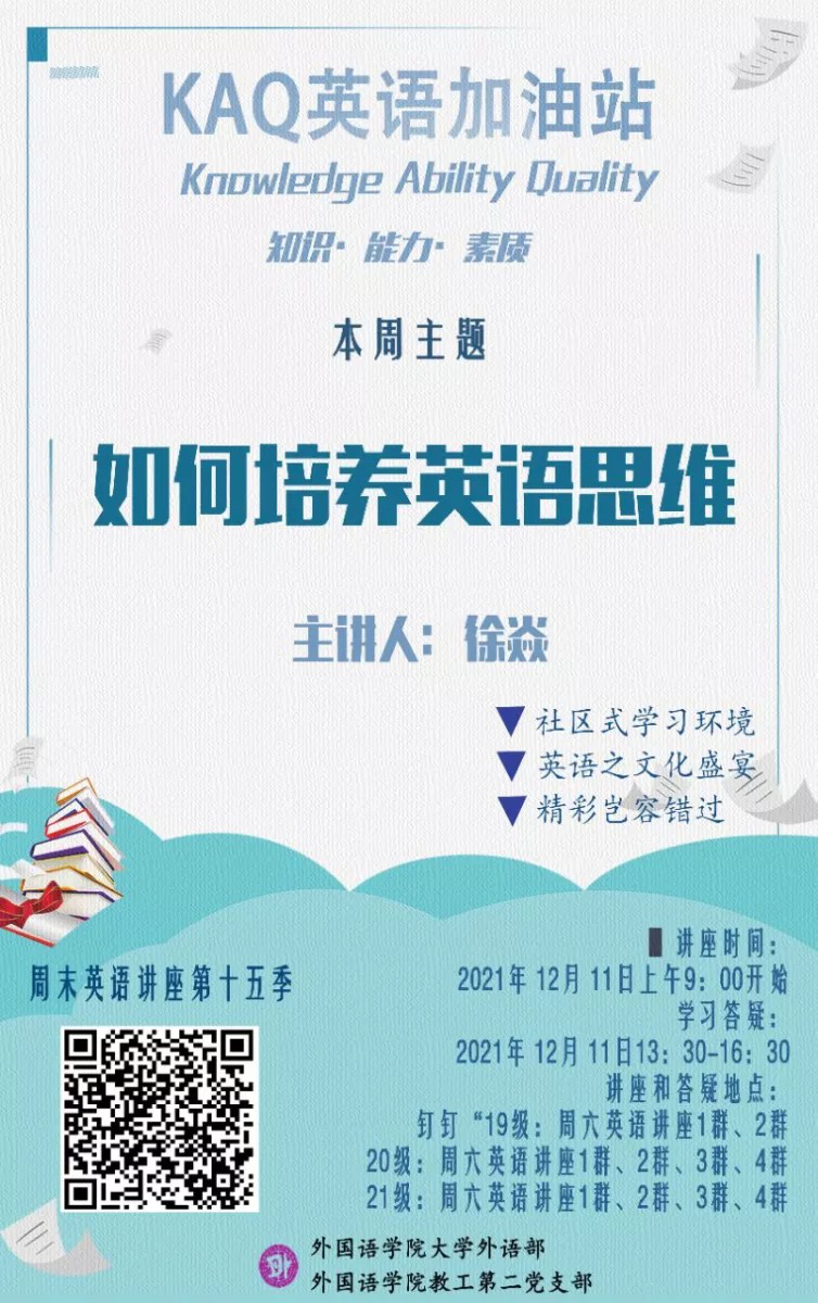 为了提高同学们的英语表达能力,2021年12月11日周六上午9点,大学外语部的徐焱老师给同学们带来了题为“如何培养英语思维”的讲座。