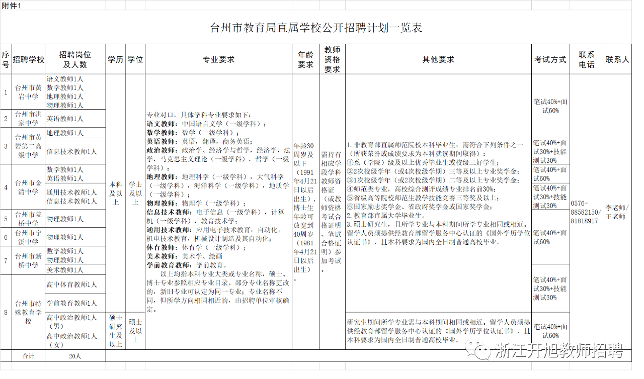 台州市教育局直属学校计划招聘学科教师共20名。本次招聘单位均为全额补助事业单位,学校均位于台州市区。具体招聘岗位、人数和招聘条件详见附件1,或登录下列网站查询: