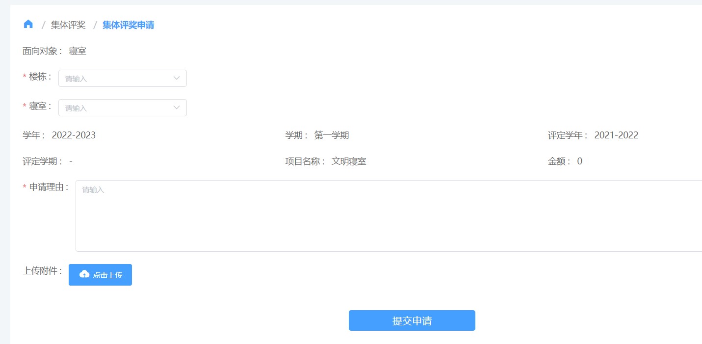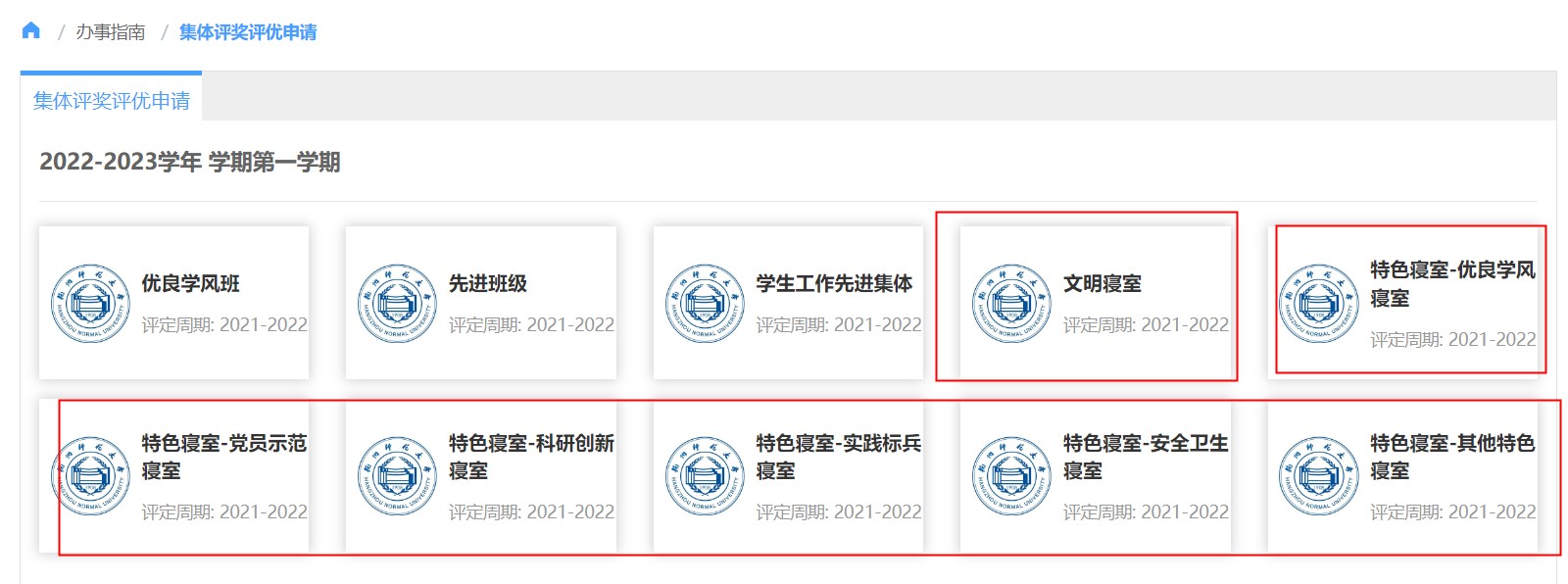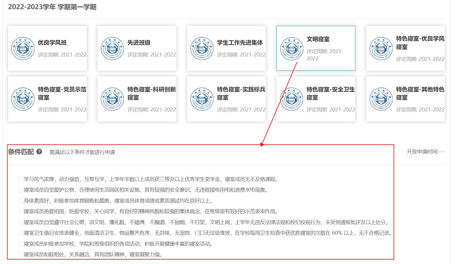 上报要求:有意向申报的寝室长于10月15日中午12:00前,登录学工系统进行申报,每一项荣誉点击以后会出现相关条件,查看是否符合,符合的进行全部勾选以后,即可进行下一步操作。