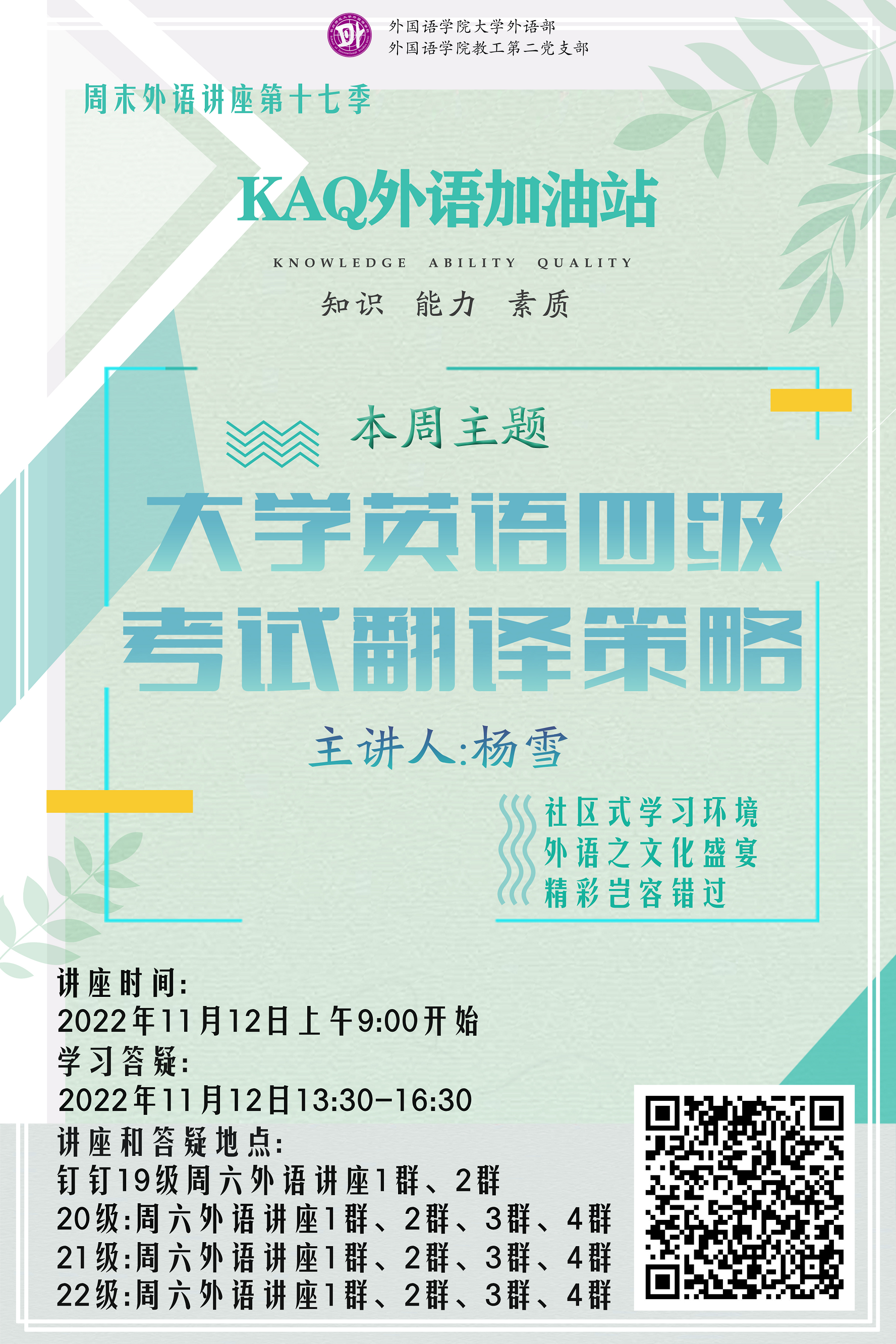 为了满足师大学生在外语能力上“一精多会”和“一专多能”的需求,“周六外语公益讲座——‘KAQ(知识、能力、素质)外语加油站’”,秉持一贯的SIM(student-centered, Innovative,Multilingual)理念,坚持“以生为本、不断创新、多语种国际视野”。考虑到学生对于英语文学知识等方面的广泛兴趣,在大学英语四六级考试即将来临之际,特邀请大外部的杨雪老师为同学们带来了题为“大学英语四级考试翻译策略”的讲座。讲座于2022年11月12日上午进行,通过14个钉钉群进行线上联播。