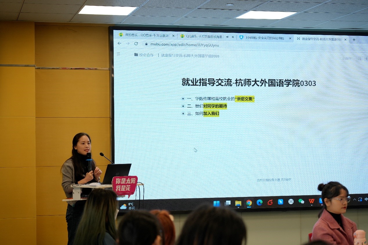 华数人力资源部经理王佳燕为同学们做了就业指导。她表示,华数历来重视与高校的交流与合作,积极与高校搭建合作平台。在谈到企业对于人才的要求时,她强调学习能力、沟通协作能力等都是企业所看重的,希望同学们在这些方面不断精进。她还介绍了华数的招聘岗位和相关要求,就应聘的流程和方法技巧进行了分享。最后,她希望未来有更多同学们加入,在华数发挥自己的才能。此外,在华数工作的杭师大校友吴晶和大众市场部渠道管理专员惠婵以自己的职场经历为同学们传授了就业、择业经验。