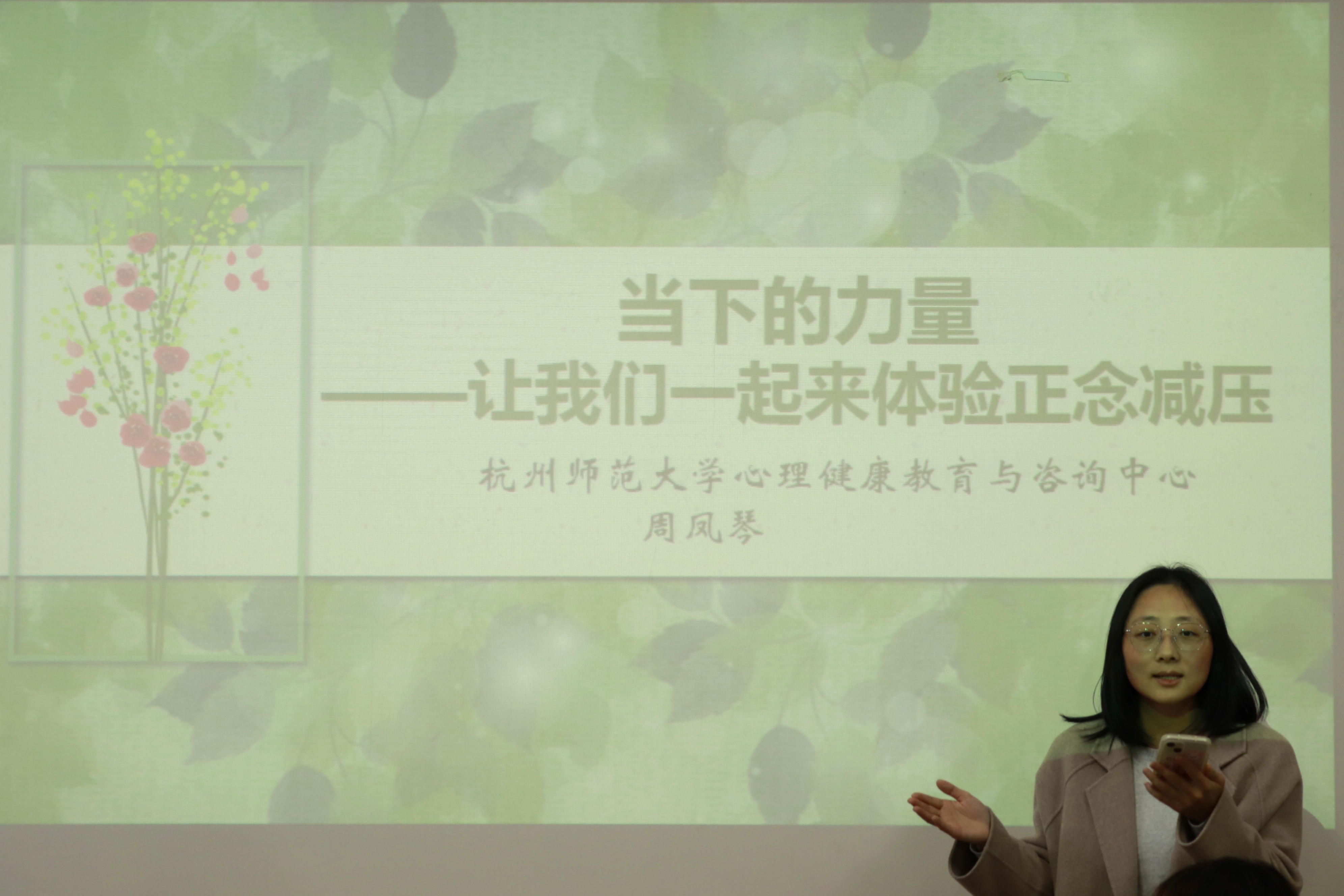 12月9日下午,由专职心理咨询师周凤琴老师主讲的讲座“当下的力量——让我们大家一起体验正念减压”在下沙校区C号楼104西顺利举行,此次心理团辅活动为外国语学院“我为学生办实事”系列活动之一。外国语学院25名学生代表参与本次讲座,辅导员张培艺老师主持。