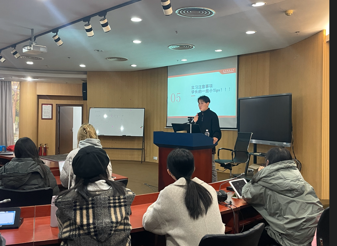 朱政同学首先向大家介绍了自己的基本情况和实习经历,之后他又给同学们展示了自己的职业路径规划。他提到,在进行规划时,如果暂时没有很清晰的思路,可以尝试以结果为导向,反向思考,以此来确定自己下一步的计划。接着,他分享了自己在进行了多次实习后得到一些收获。第一,要始终树立“owner”意识,要做自己的领导者,想要什么都要自己去争取。第二,要摆脱学生思维,要以结果为导向,做到有计划有思路地完成自己的工作,在工作过程中也不要畏惧和他人的交接,敢于沟通才能快速提高自己沟通能力。第三,我们要培养自驱力,要做到主动学习,要注重提升自己的总结能力、思考能力和复盘能力。另外,我们在实习期间也要避免无意义的重复工作,要给自己减负。他还就如何寻找岗位、投递简历等方面内容进行了经验分享。他向同学们介绍了多种简历投递渠道,如牛客、实习僧等软件以及小红书找继任等快捷途径。朱政同学也分享了一些面试中常见的问题,提供了一些面试的回答话术,罗列了一些技能需求侧重点。