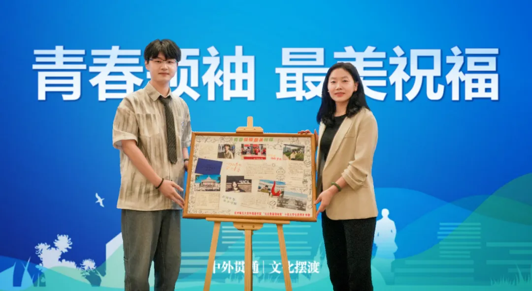 马云公益基金会为师大学子设立了“马云青春领袖奖”,旨在树立优秀典范,激励青年优秀人才,传播青春正能量。在活动中,外国语学院往届“马云青春领袖奖”获得者徐悦、张一凡、何翼飞、龚自清以视频形式向马云公益基金会表达了诚挚的感谢,并勉励在场学子勇敢追梦,迎接挑战,把握机遇。之后,第九届“马云青春领袖奖”获得者刘志铭上台分享了他在基金会资助下的研学经历。往届获奖者们将代表感谢的明信片从各自深造的学校寄出、装在画框里,敬赠给于秀红女士。