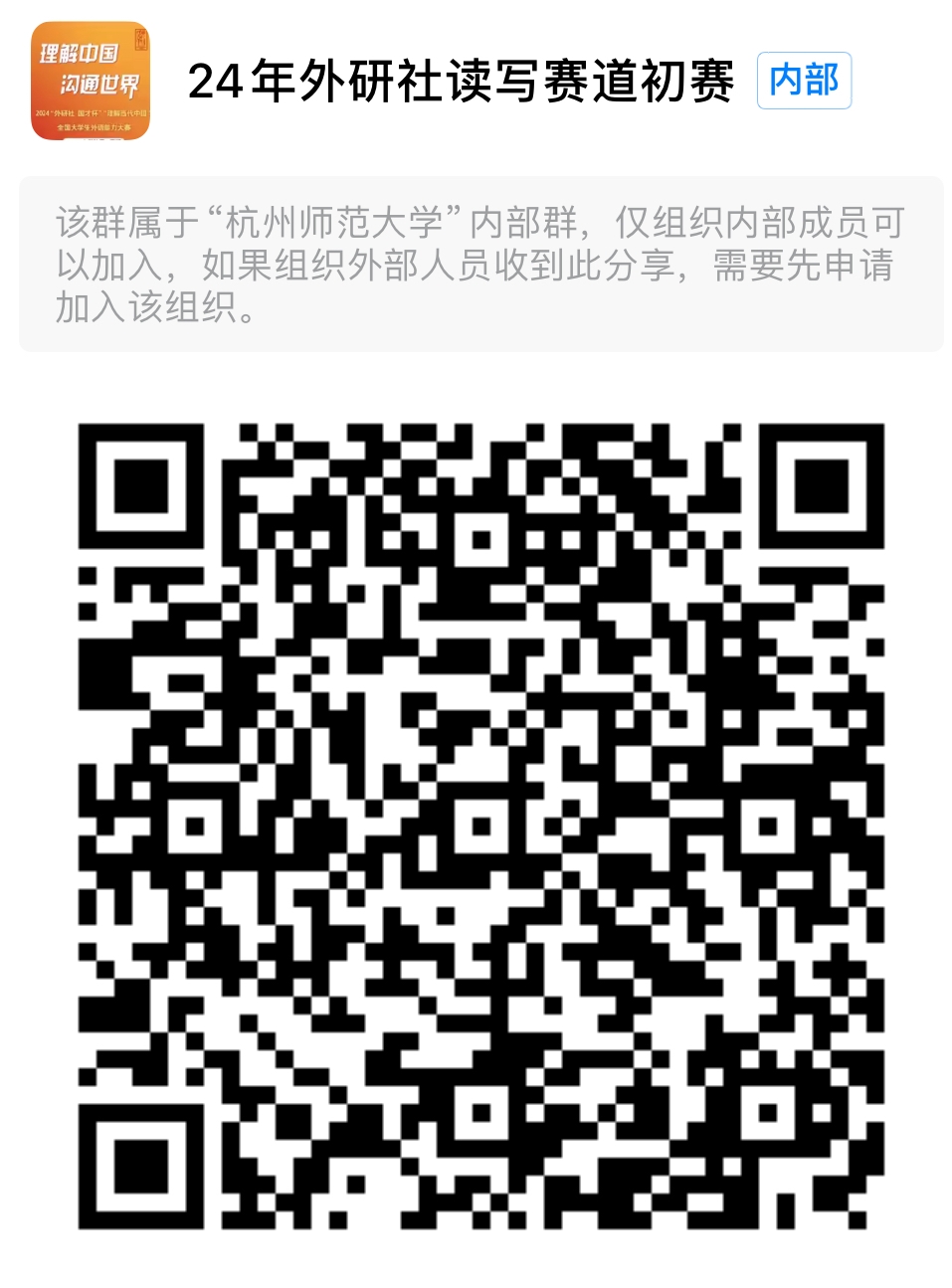 2024年6月25日21点前,扫码加入“24年外研社读写赛道初赛”钉钉群,填写群内报名信息,并可在群内进行赛事咨询。