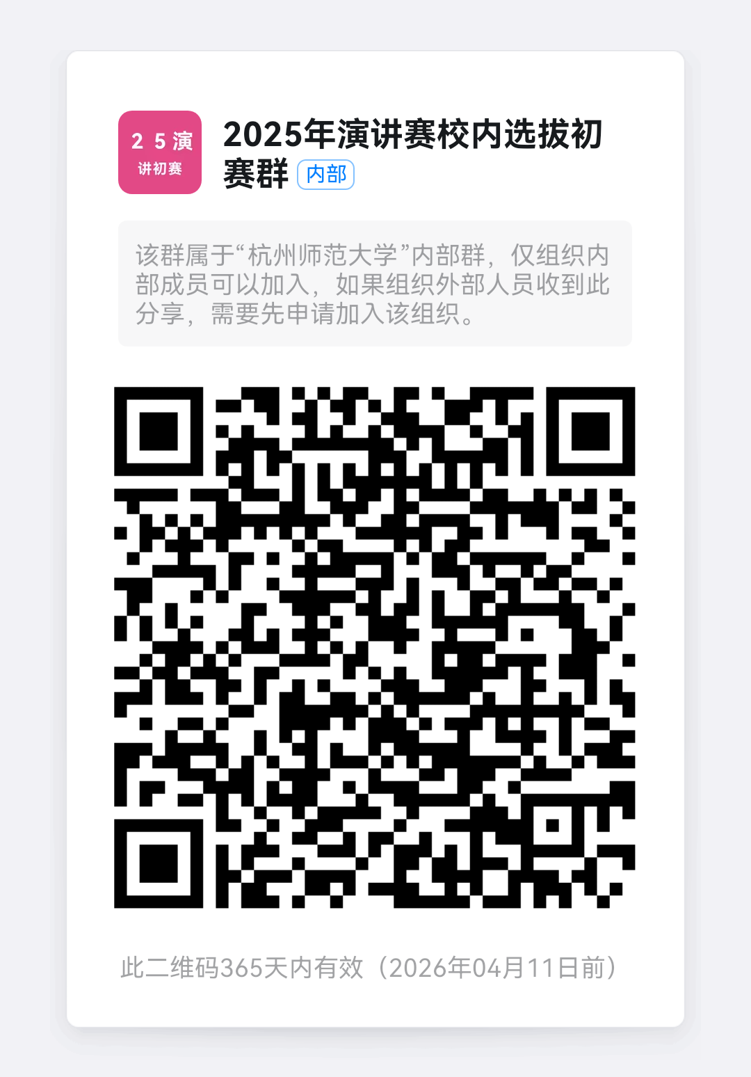 自主报名。报名同学需先加入钉钉群,并可在群内进行赛事咨询。扫描下面的二维码或搜索“2025年演讲赛校内选拔初赛群”加入钉钉群。