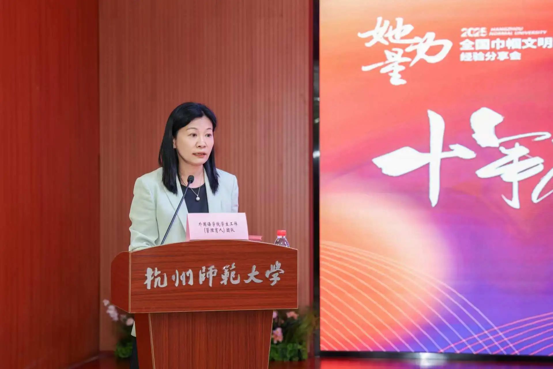 分享会中,历任巾帼文明岗岗长——现党委学工部部长金向华,与生命与环境科学学院党委副书记王倩也回顾了在外国语学院管理育人团队坚持立德树人根本任务不动摇,十余年接续奋斗,充分发挥“半边天”作用,齐心协力争创巾帼文明岗的历程。“回想起岗位创建的历程,其实光靠干劲、激情是远远不够的,我们从团队成立以来,就一直在设想我们的工作到底应该怎么做,开展有组织创岗工作。”朴实而真挚的话语,深深打动了在场的每一位听众,现场不时响起热烈的掌声。