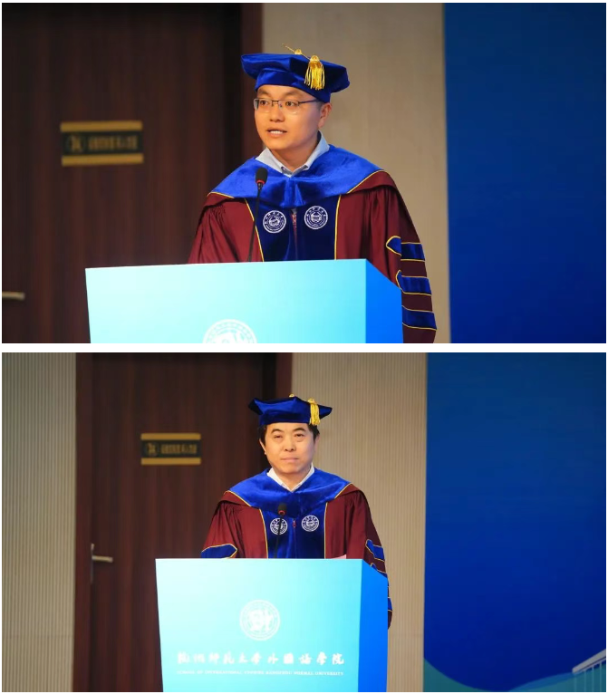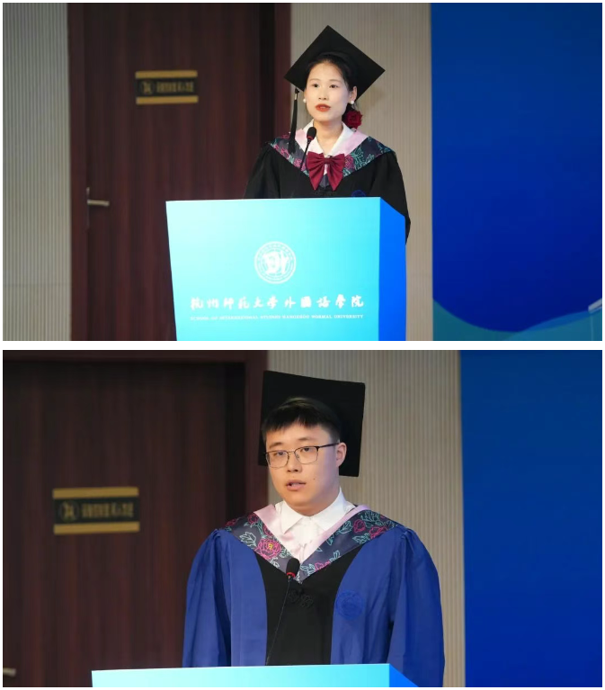 优秀本科毕业生代表经亨颐(英语)213班阳薇与优秀研究生毕业生代表2022级英语语言文学计郑澳相继发言,他们感谢母校的对他们的支持与陪伴,他们将从外院出发,带着自信与从容走向更广阔的天地。
