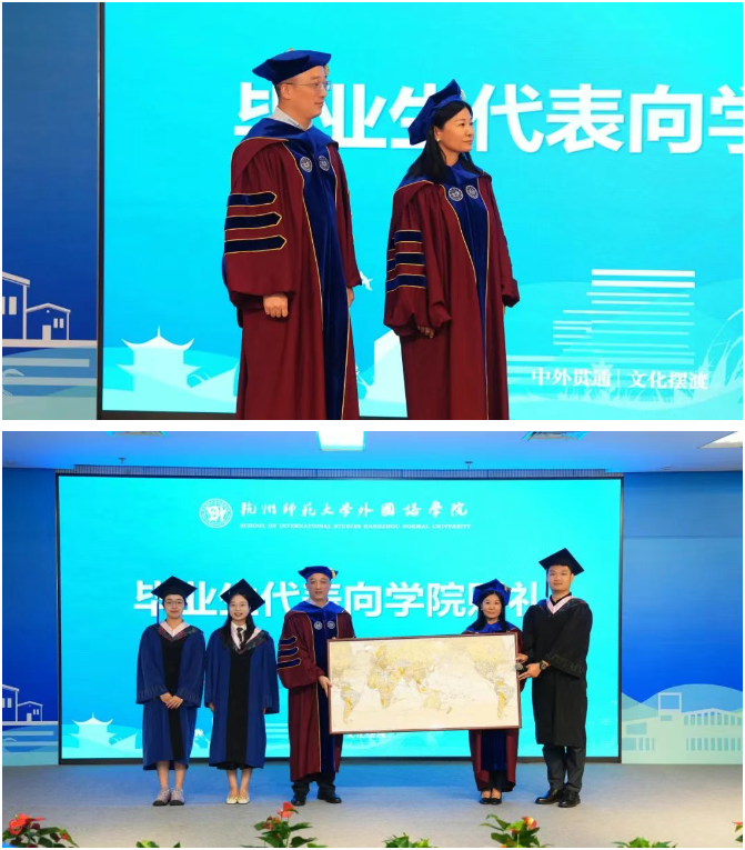 毕业生代表翻译211班本科生袁铭欣、2022日语语言文学研究生黄欣悦、2022英语语言文学金宣慧向学院赠礼,献上外院全体学子的心意,周敏院长、袁智杰书记代表学院接受赠礼。