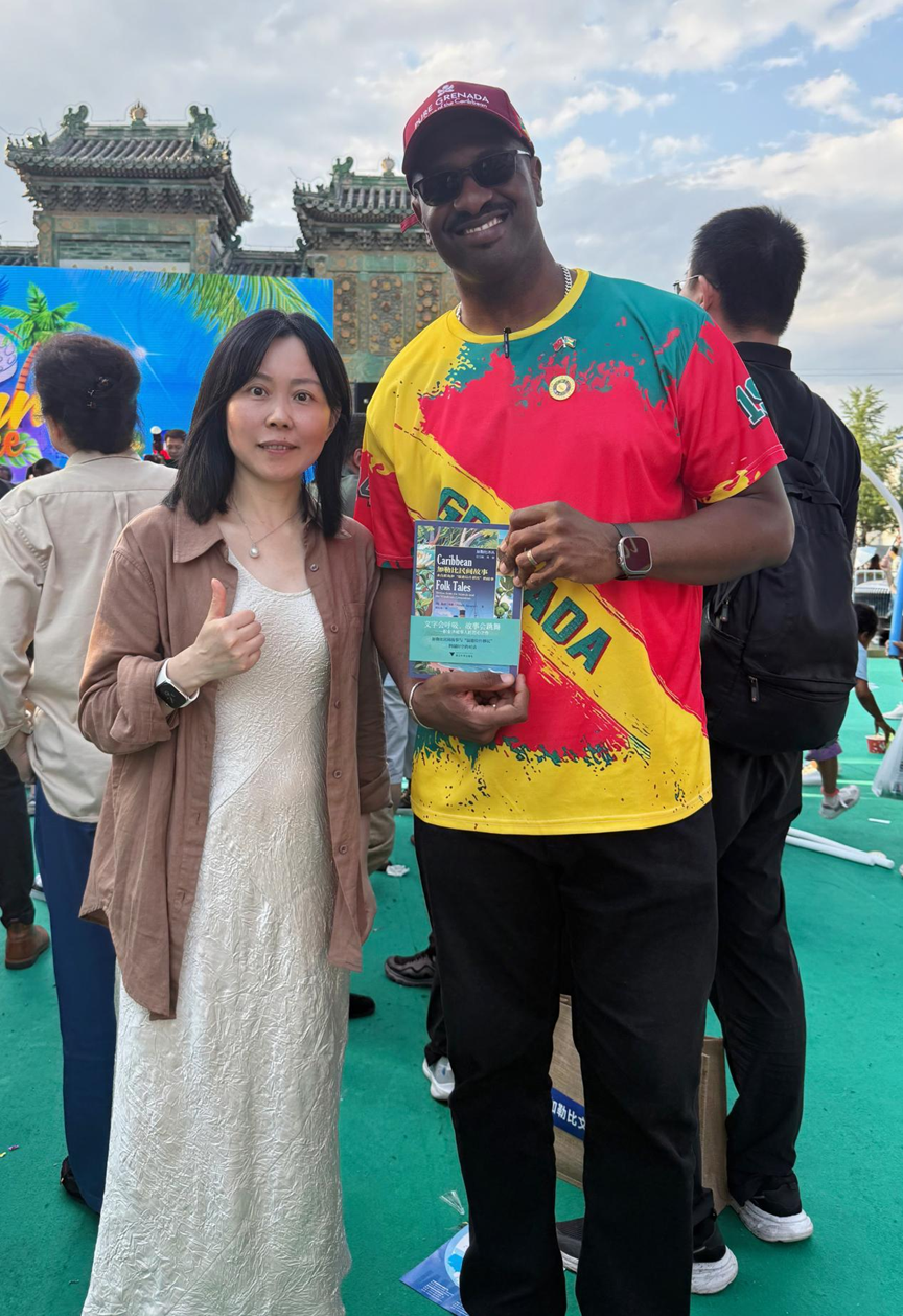 陈忆玮老师向格林纳达驻华大使马岩阁下介绍中心“加勒比译丛”,并赠送她的加勒比文学文化译著——《加勒比民间故事:来自群岛和“温德拉什移民”的故事》。