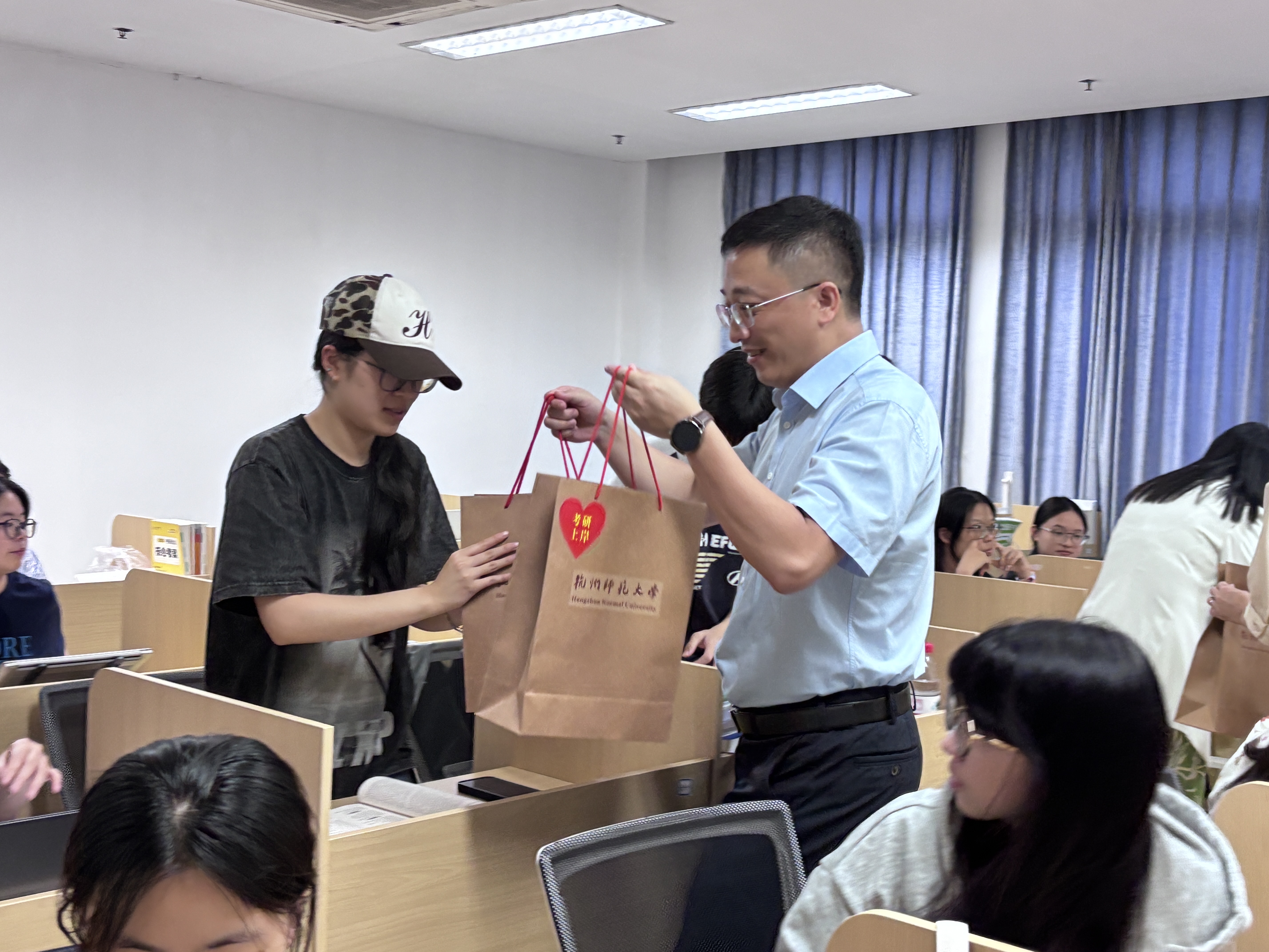 随后,周敏院长和袁智杰书记为同学们送上精心准备的“考研加油包”,将学院的深切关怀与殷切期望传递到每一位学子心中,让暑期的自习教室充满了温情与力量。同学们纷纷表示,学院领导的慰问让大家倍感温暖、备受鼓舞,不仅增强了备考的动力,更让大家感受到了“外院大家庭”的凝聚力。