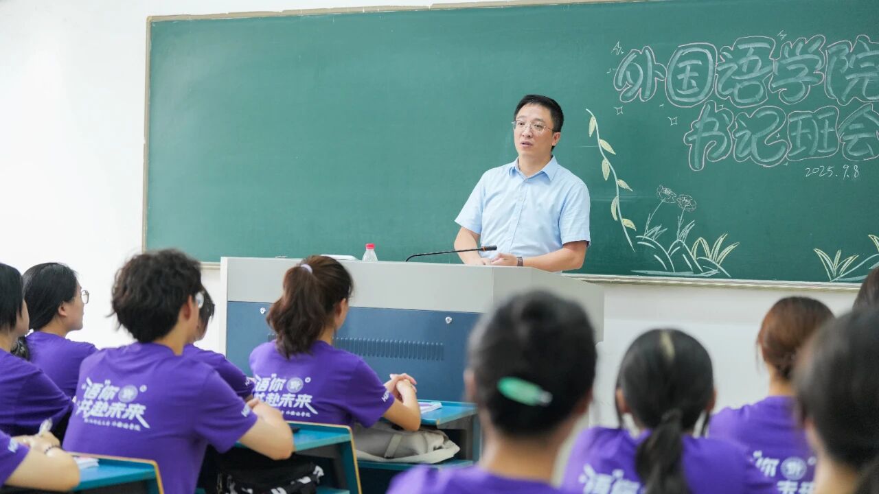 2025年9月8日上午,外国语学院2025级全体新生干部迎来了一堂特殊的大学第一课。本次班会课由新生辅导员李可人主持,袁智杰书记讲授。大学不仅是知识的海洋,更是人生的锻造场。如何在这关键的四年走正、走宽、走稳人生路,袁智杰书记为新生们指明方向。