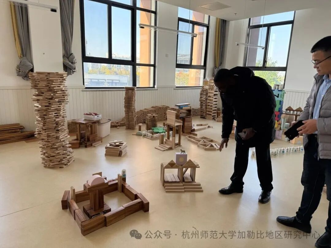 从奥尔夫音乐教室的专业教具到美术创意区的幼儿作品,Fearon教授不时驻足,亲手操作互动教学设备,询问各类教具的具体功能及其教育价值。